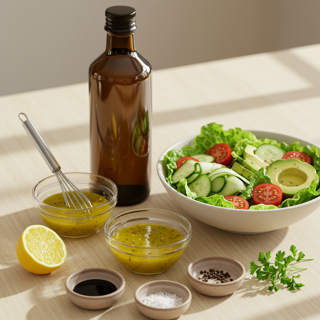 - 재료: 생들기름 3스푼, 레몬즙 2스푼, 간장(또는 발사믹 식초) 1스푼, 다진 마늘 0.5스푼(선택), 소금 약간, 후추 약간