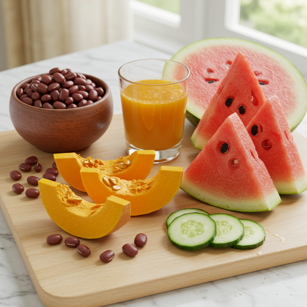 - 팥: 팥은 사포닌과 칼륨이 풍부하여 이뇨 작용을 촉진하고 몸속 노폐물과 불필요한 수분을 배출하는 데 탁월합니다. 팥물이나 팥죽으로 섭취하면 좋아요.